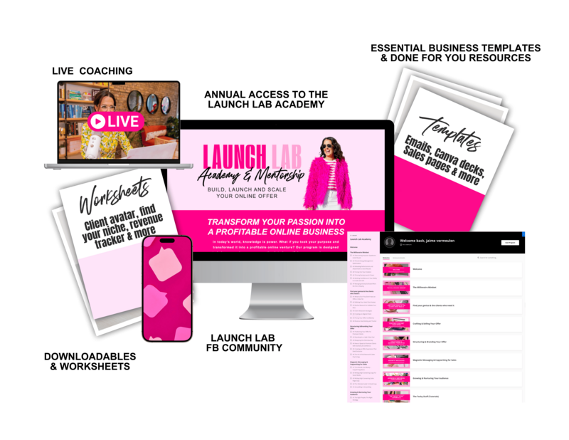 Access to Launch Lab Academy a step-by-step course that shows you how to turn your idea into a high-ticket offer and launch it with confidence.